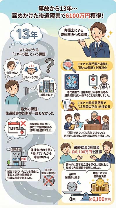 本件は、事故から約13年後に⾼次脳機能障害(後遺障害7級)が認定され、最終的に約6100万円もの 賠償⾦の⽀払いを実現した極めて稀な解決事例です。