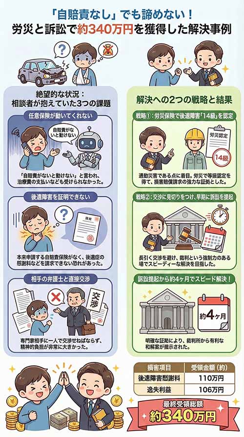 【自賠責なし・車検切れで労災14級】訴訟で約340万円を獲得し早期解決した事例(20代男性)