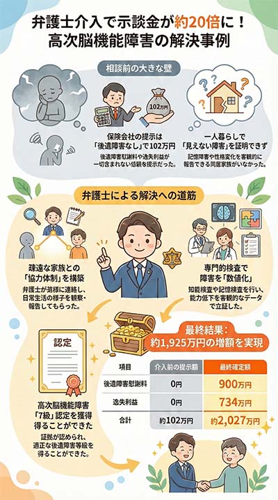 独り暮らしで⾼次脳機能障害7級認定!疎遠な家族と連携し約2,027万円 での解決を実現した事例