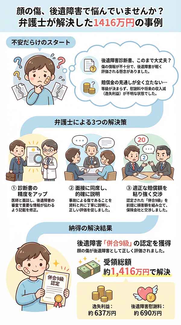 加えて、本件では医師への照会と醜状面接の同行が解決のポイントになりました。後遺障害9級を獲得し、受領総額約1,416万円を獲得しました。