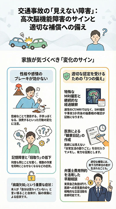 事故直後に「意識を失っていた時間(意識障害)」がどれくらいあったかを確認し、本人の「事故前と違う言動」を日付入りでメモに残してください。