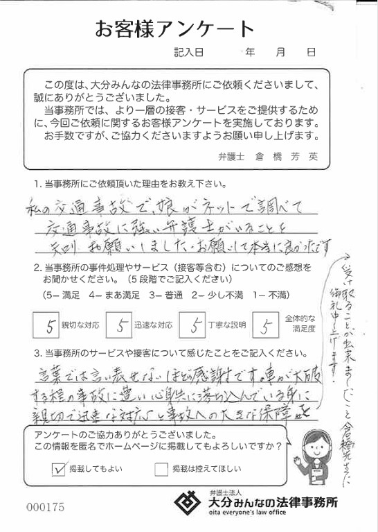 ホームページで大分県で交通事故に強いというフレーズを見て、交通事故専門にされている先生にお願いしたいと思い、依頼させていただきました。